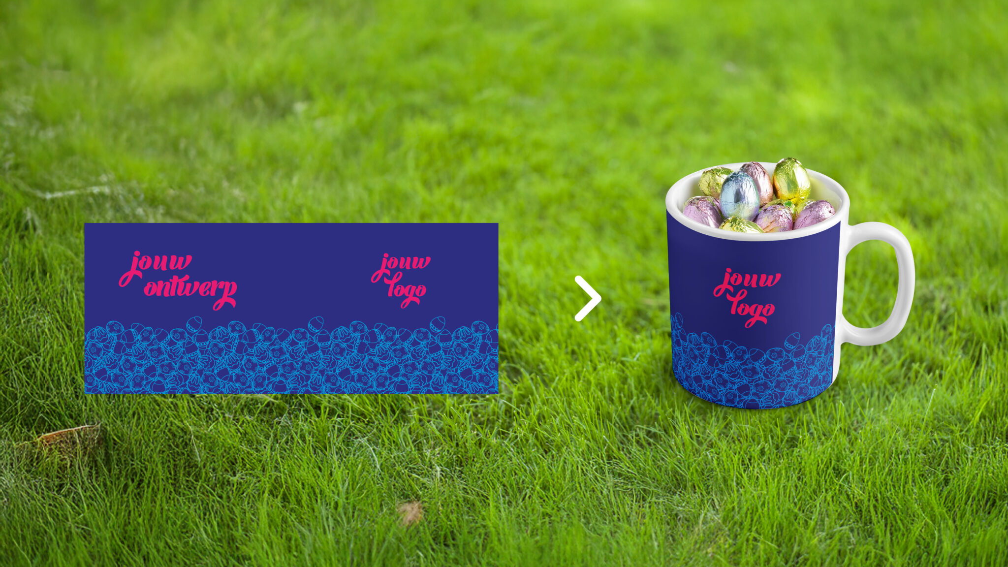 Mok met eigen full colour ontwerp. Gevuld met ca. 250gram eitjes.